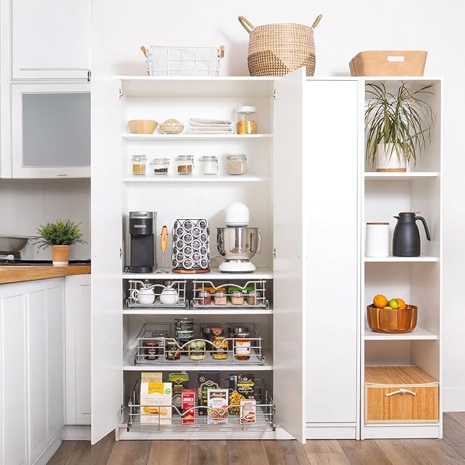 - 2-TIER PULL OUT CABINET ORGANIZER: Maximize kitchen space with dual pull-out shelves that slide independently for full-extension access. Easily organize cookware, pantry items, or cleaning supplies in hard-to-reach cabinets.
