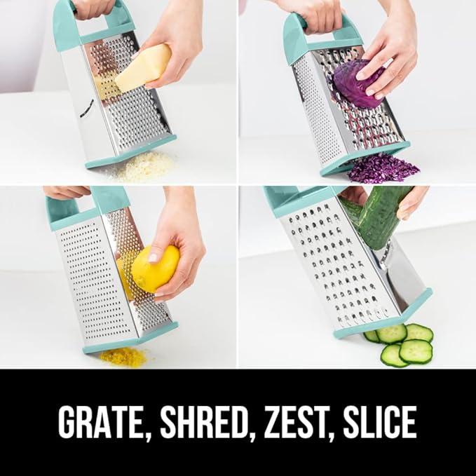 - ZEST, SHRED, SLICE, GRATE: say goodbye to endless kitchen tools and hello to the 4 in 1 all purpose cheese grater; 4 sides allow you to grate, shred, zest and slice nearly any food with ease; use on vegetables, fruits, chocolate, bread, cheeses, and just about anything else to create delightful recipes