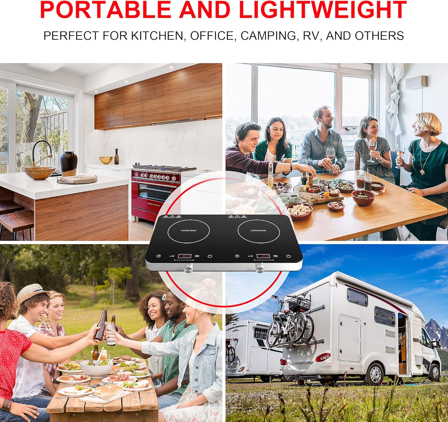 - 𝐏𝐎𝐑𝐓𝐀𝐁𝐋𝐄 𝐀𝐍𝐃 𝐅𝐋𝐀𝐓 𝐃𝐄𝐒𝐈𝐆𝐍: Measures 22.05 x 12.20 x 1.90 in. Weighs only 5.84 pounds. The induction cooker is compact and light, easy to install and carry, which is a great choice for limited space such as kitchen, recreational vehicle, office, camping. The smooth glass surface is scratch-resistant, waterproof, and highly decorative.