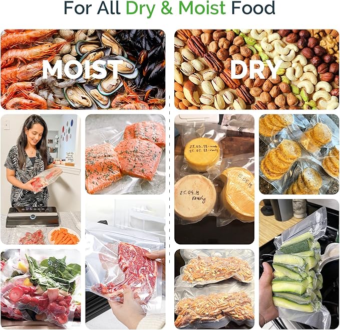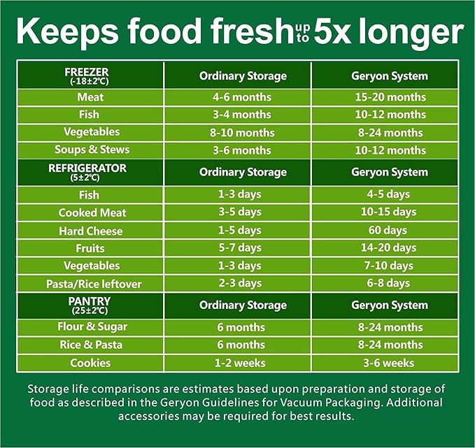- Great Vacuum and Seal Result: double sided texture of each GERYON bag sealer bags, which block both oxygen and moisture to maximize air removal, eliminate freezer burn. Keep the food 3-6 times longer fresh, lock freshness, flavor and nutrition inside