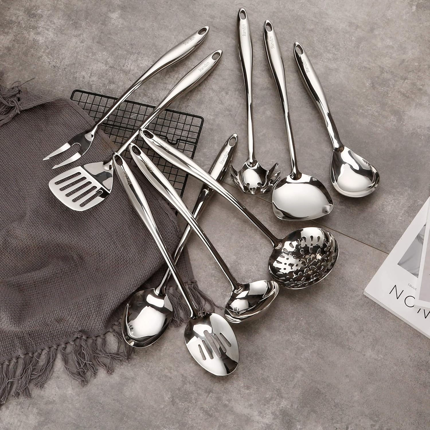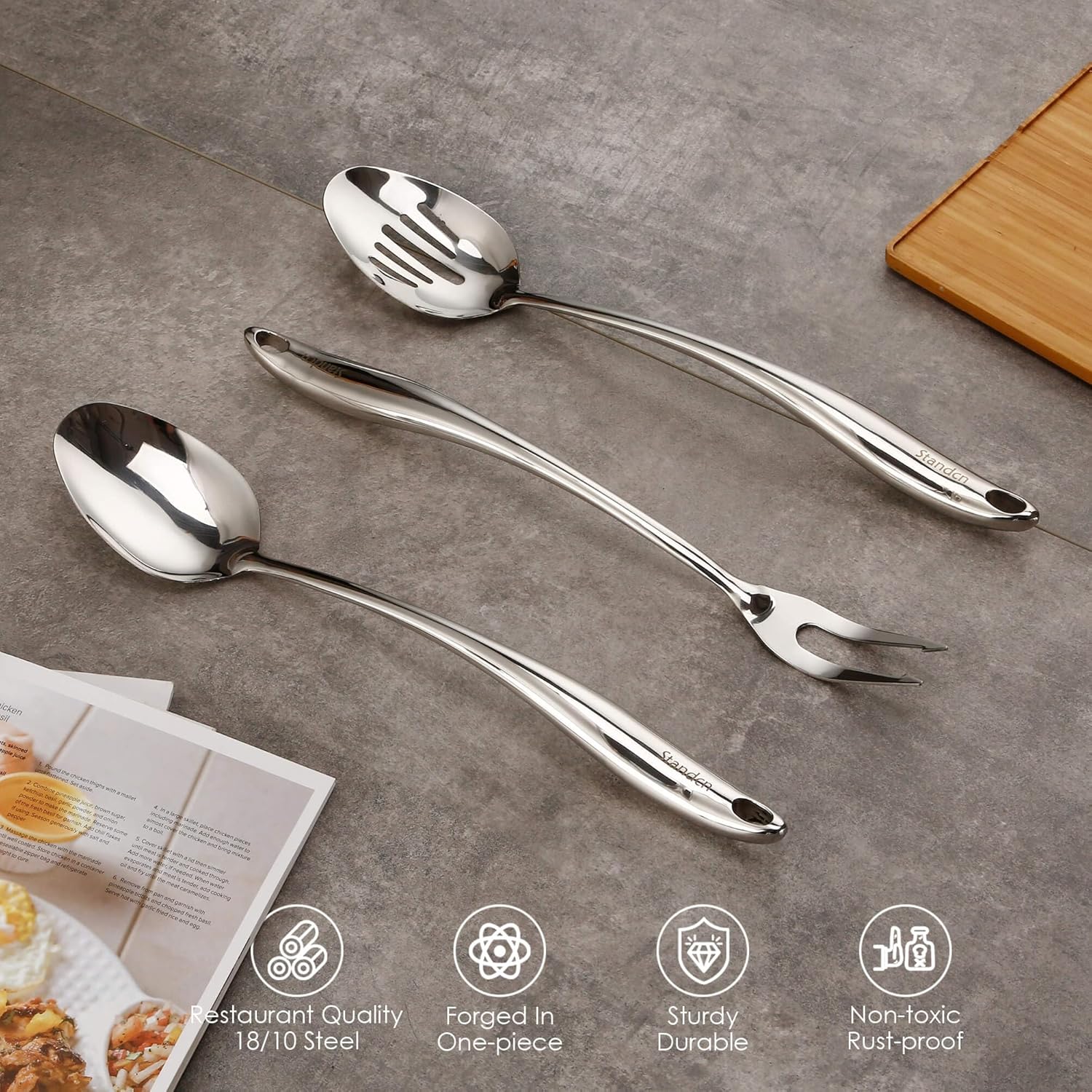 - 15inch lightweight cooking spoons, ergonomic design, precise balance, excellent grip, long handle to provide high heat resistant, make sure the chef's hands stay cool(The large hollow handles make it slightly lighter than Standcn's other utensils)