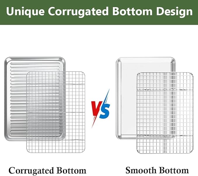 - 【Healthy Material】 The baking sheet with wire rack are made of high quality stainless steel without any chemical coating, wouldn't create chemicals at high-temperature baking, great replacement to aluminum pan, rust free and healthy for your daily use.