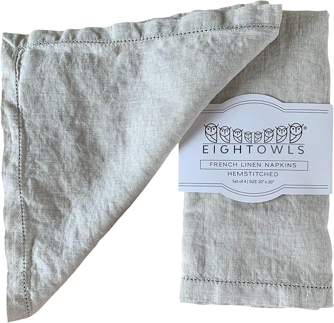 - Hemstitched stonewashed french linen cloth dinner napkins with mitered corners size 20 x 20 inch and packaged as a set of 4