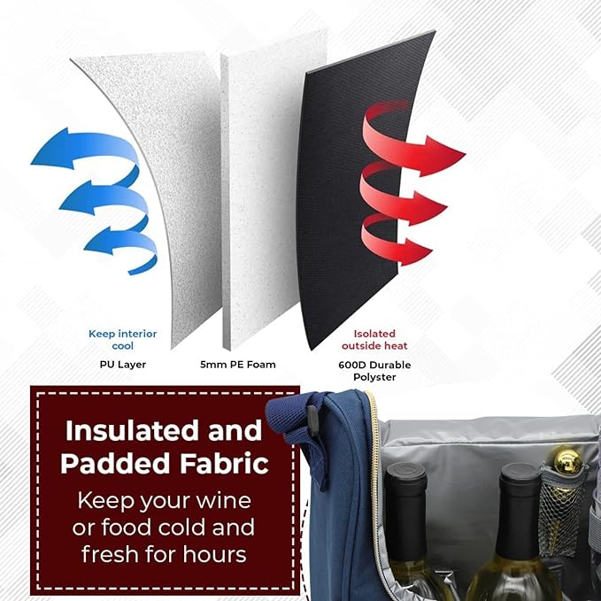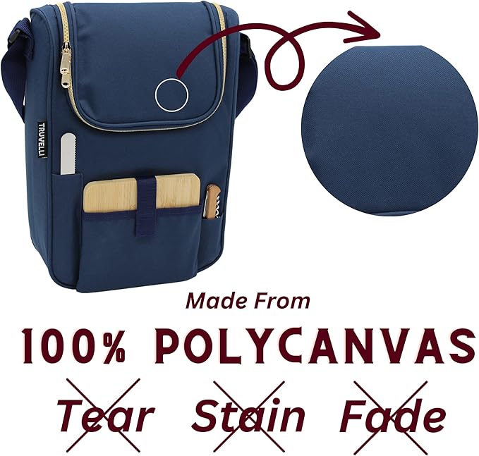 Truvelli Plush Picnic Premium Wine Bag, 7-in-1 Insulated 2 Bottle Wine Carrier Tote, Wine & Cheese Cooler Bag, Great Gifts for Wine Lovers (Deep Blue)