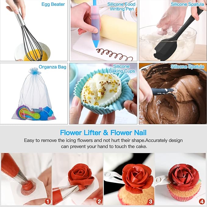 - COMPLETE CAKE DECORATING KIT: This cake decorating kit is perfect for professional bakers or starters. It includes all the tools needed to decorate cakes, such as cake turntable, cake carrier, cake board, 2 acrylic round cake disks, 2 cake pans, 48 numbered piping tips and brush, and 10 measuring cups, 8 fondant modeling tools, 100 baking cups, a dish brush, 15" cake cutter and slicer, an egg beater, and 50 disposable piping bags etc. You can achieve professional-looking results with this kit.