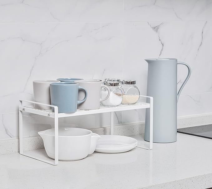 - EXTRA SPACE: These stackable cabinet shelves maximize storage efficiency, providing more spaces as a riser which allows you to use the upper space. The added storage space helps organization and tidiness. All the wee little bottles, tins, vials, pans and a myriad of other kitchen utensils could go underneath, the middle or the top of the cabinet shelf, reaching with ease.