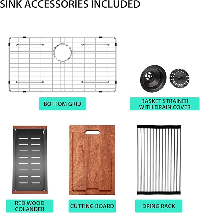 - Comprehensive Workstation Setup - This all-in-one package includes everything you need for a fully functional kitchen workspace. It comes with a 25 inch kitchen sink, a cutting board, a dish rack, a bottom grid, a drain assembly, a redwood handle colander, mounting clips, a cutout template paper, and installation instructions. The integrated ledge allows you to slide accessories across the sink, maximizing your countertop space