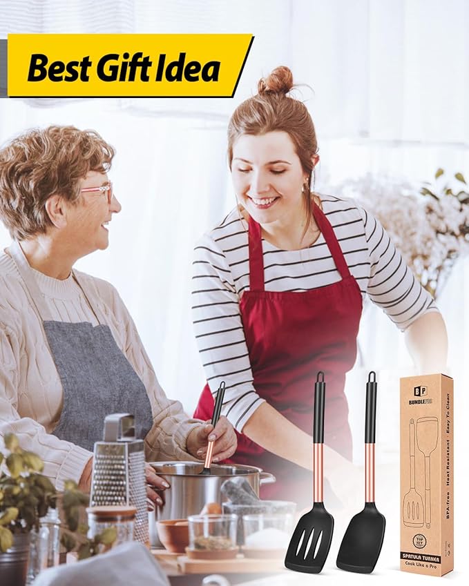 Pack of 2 Silicone Solid Turner, Non Stick Slotted Kitchen Spatulas, High Heat Resistant BPA Free Cooking Utensils, Ideal Cookware for Fish, Eggs, Pancakes(Rose Gold Black)