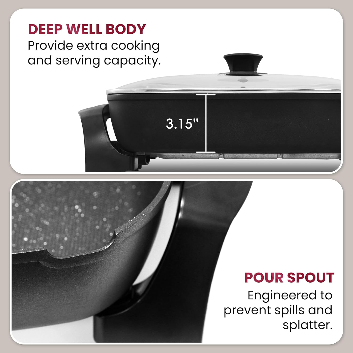 Elite Gourmet EG6203 Extra Deep 16"x13"x3.2" (10.5Qt.) Scratch Resistant, Easy Pour Spout, Dishwasher Safe, Non-stick Electric Skillet with Vented Glass Lid, Adjustable Temperature, Black