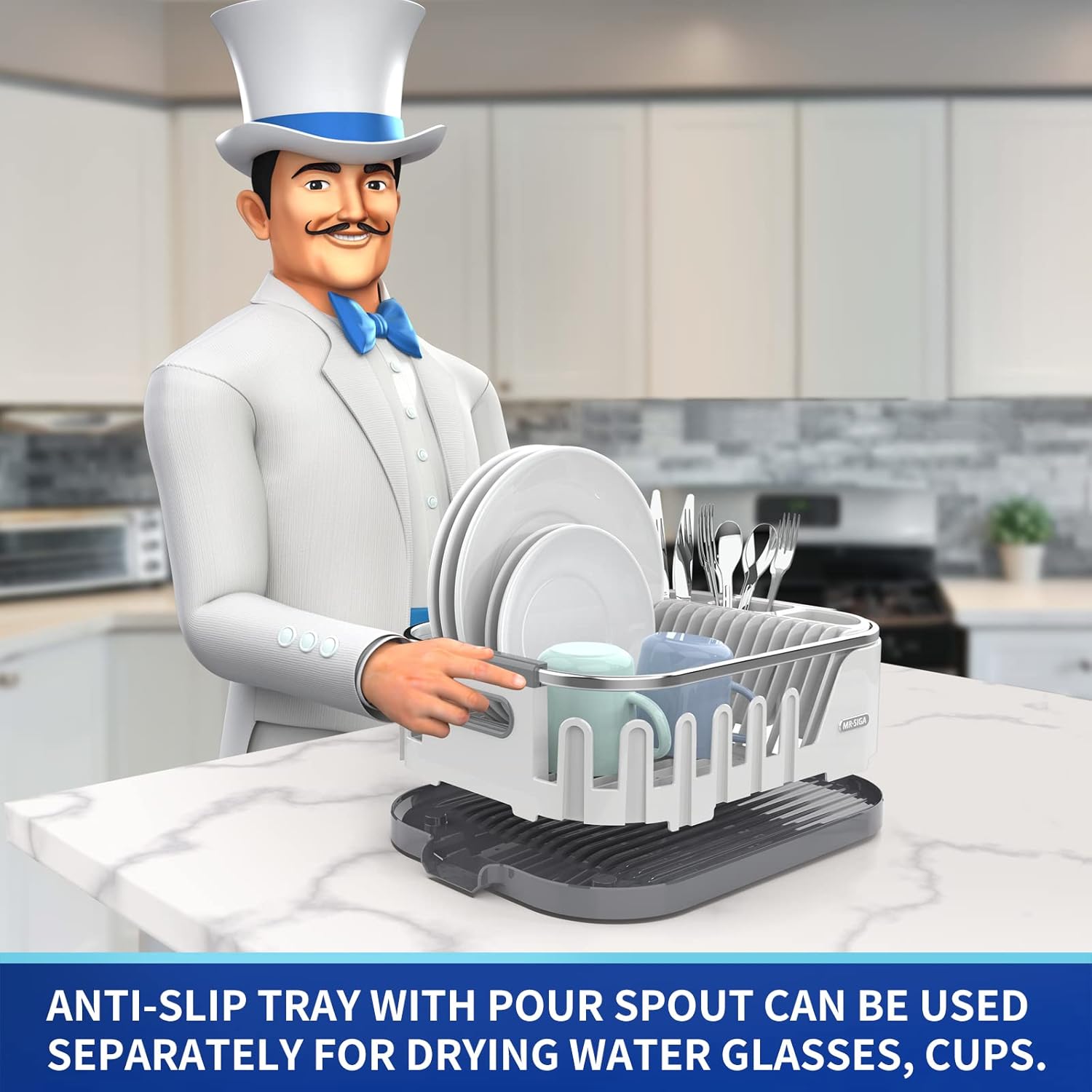 MR.SIGA Dish Drying Rack for Kitchen Counter, Compact Dish Drainer with Drainboard, Utensil Holder and Cup Rack, Plastic Kitchen Drying Rack for Dishes, Cups, Knives, Spoons and Forks, White