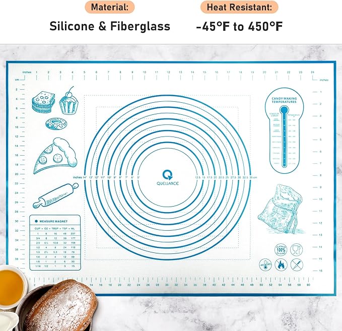 - NON-STICK SURFACE: Do not need to use extra flour or oil, this large nonstick sheet keeps work surfaces clean so you donโt have to spend hours scraping the dried dough off your counter-tops ! Even if grease or dough sticks to the surface, pastry mat can be easily cleaned to keep countertop clean and sanitary.