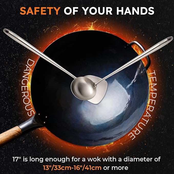 - IDEAL LENGTH AND WEIGHT:Our 17-inch stainless steel wok spatula and ladle set is long enough to match any kitchen wok of 13-14 inches or large.Finely polished,smooth curved edges of the cooking tool protect your woks, keep the cookware surface not scratched or dented,extend the life of all your kitchen woks