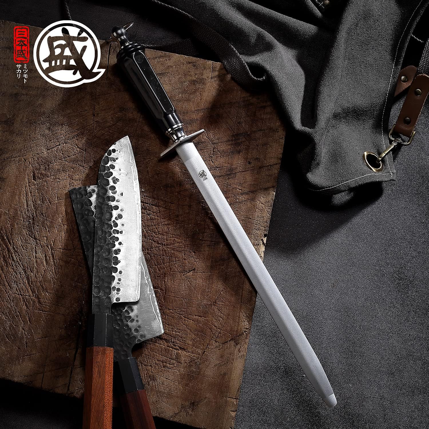 MITSUMOTO SAKARI 10 inch Japanese Honing Steel - Flat Diamond Knife Sharpening Rod, Professional High Carbon Sharpener with ABS Handle & Powerful Magnet