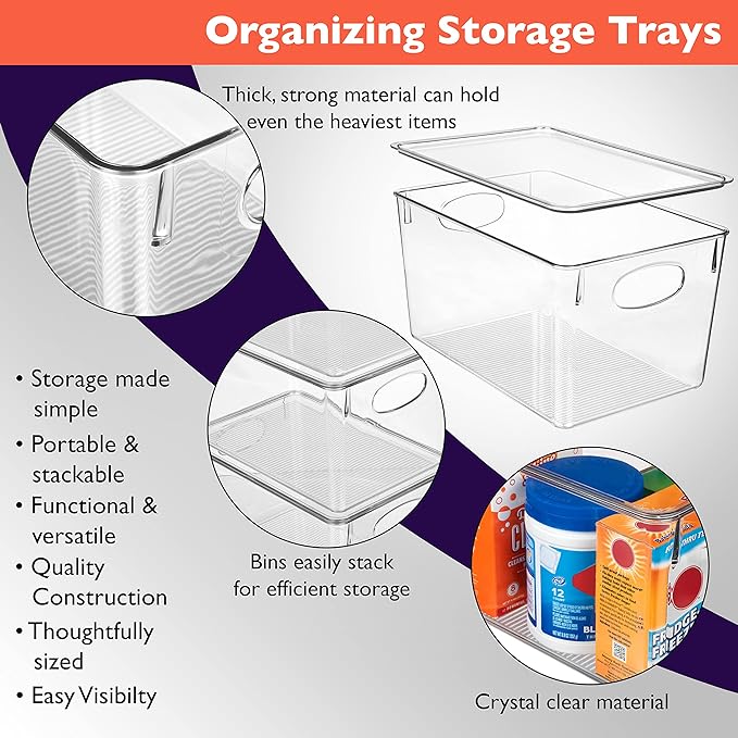 - PORTABLE & STACKABLE – Built-in, easy-grip side handles and lids make it easy to transport from place to place. These plastic storage bins are perfect for pantry organization and storage or kitchen organization. These clear storage bins are great for anywhere in your home.