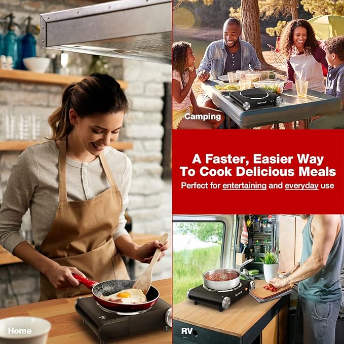 - [ADVANCED HEATING TECH] - Portable electric burner with thermostatically controlled heating settings, advanced infrared thermal cycling and thermal protection make it easy to cook a variety of foods such as warm sauces, scrambled eggs, grilled steak, soup, pasta, veggies and so much. In addition, you can use it as an extra burner to keep the food warm.