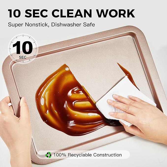 - EXQUISITE CRAFT - The cookie sheets for baking nonstick set is made of carbon steel, which is sturdy and durable. Compared with glass or ceramic sheet pan, it is unbreakable. One-piece seamless design with no dead ends and rounded corners for greater safety, Smooth curved edges prevent finger injuries