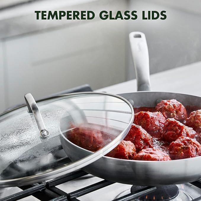 GreenPan Chatham Tri-Ply Stainless Steel 12 Piece Cookware Pots and Pans Set, PFOA and PFAS-Free, Multi Clad, Induction, Fry Saute Sauce Pans, Stock Pot, Dishwasher Safe, Oven & Broiler Safe, Silver