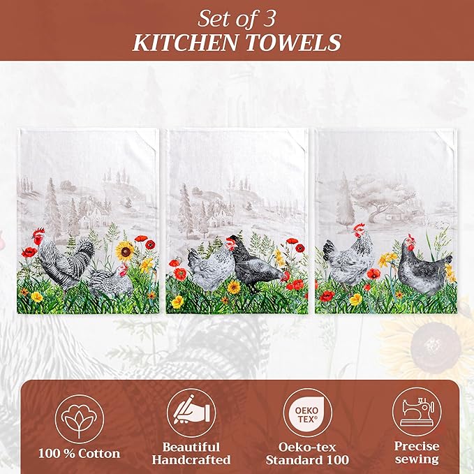 Maison d' Hermine Kitchen Towels Set of 3 100% Cotton 27.50" x 20" Reusable Cloth Tea Dish Towels Absorbent with Hanging Loop for Kitchen, Home, Dining, Cocktail Parties Spring/Summer (Basse Cour)
