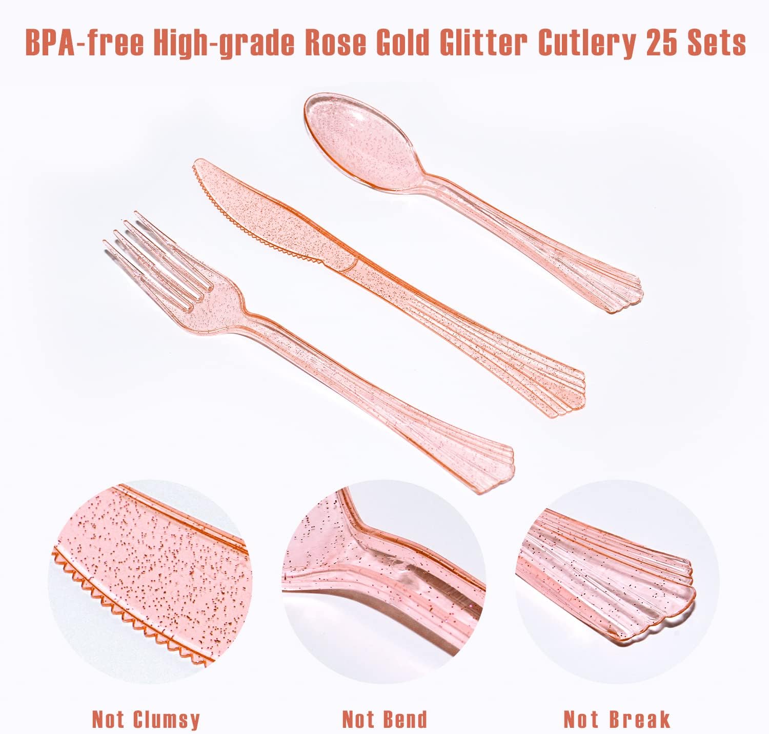 - ✔「Sever for 25 Guests」: This party dinnerware set comes with including 9" dinner paper plates *25, 7" paper dessert plates *25, 9oz paper cups *25 and luncheon napkins (3-ply and measuring 6.5" x 6.5") *25, 25 sets of heavy duty rose gold glitter plastic cutlery (25 forks, 25 spoons, 25 knives)