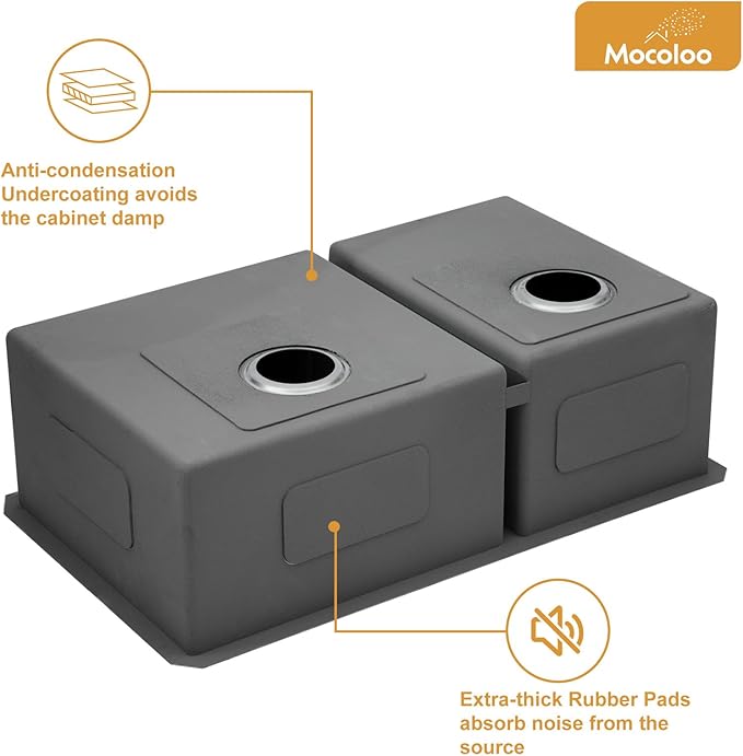- Fast Drainage & Most Quiet: Mocoloo 60/40 undermount double bowl with an X-shaped groove design and sloped bottom for more rapid drainage. The 3 mm-thick rubber pads and coating on the back are added to absorb noise and vibration, which helps prevent condensation on this 33x19 kitchen sink, thereby protecting your cabinet