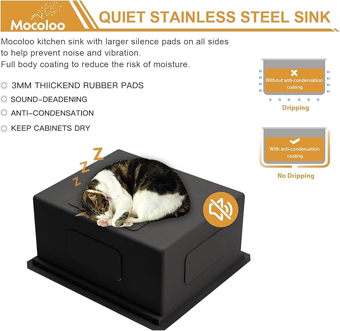 - SUPERIOR DRAINAGE: Our Mocoloo black undermount kitchen sink has bottom slope and channel groove X water guideline for fast drainage. R10 tight radius round corner is easy to clean. 10 inch depth large bowl capacity offers more room for stacking dirty dishes and washing them easily. Rear-set drain is for more usable space underneath the kitchen sink. Thick rubber pads and heavy paint undercoating are for sound dampening and prevent condensation