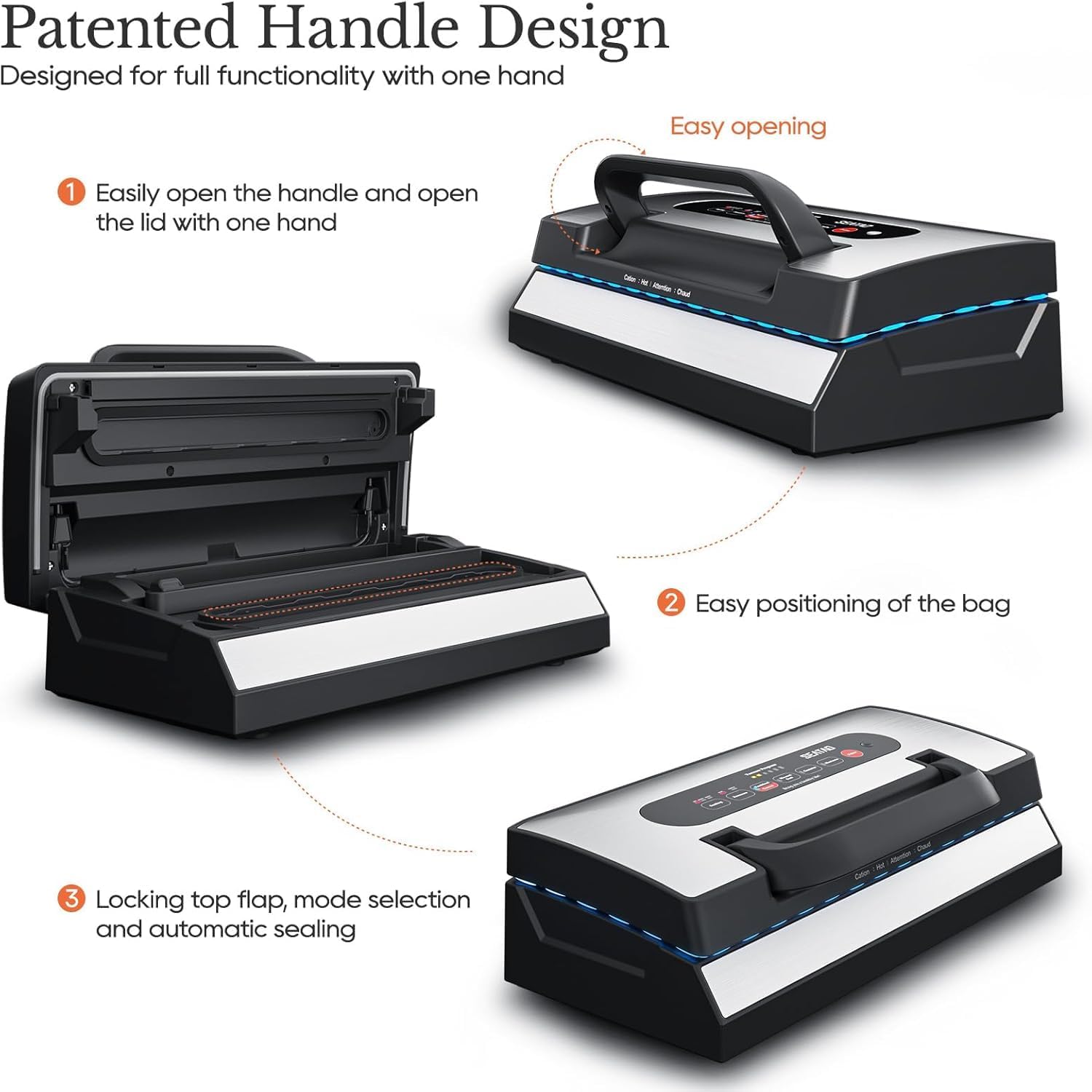 - 【Double Heat Sealing & Easy-Lock Handle】The 90Kpa vacuum sealer for liquid is equipped with dual heat sealing strips to ensure your safe sealing experience, Sealing liquid or moist food will be safer. Food vacuum sealer machine uses a patented handle system, the lid can be easily locked by pressing it with one hand instead of two, ensuring a tight and consistent seal. Provides users with a high quality friendly and convenient experience