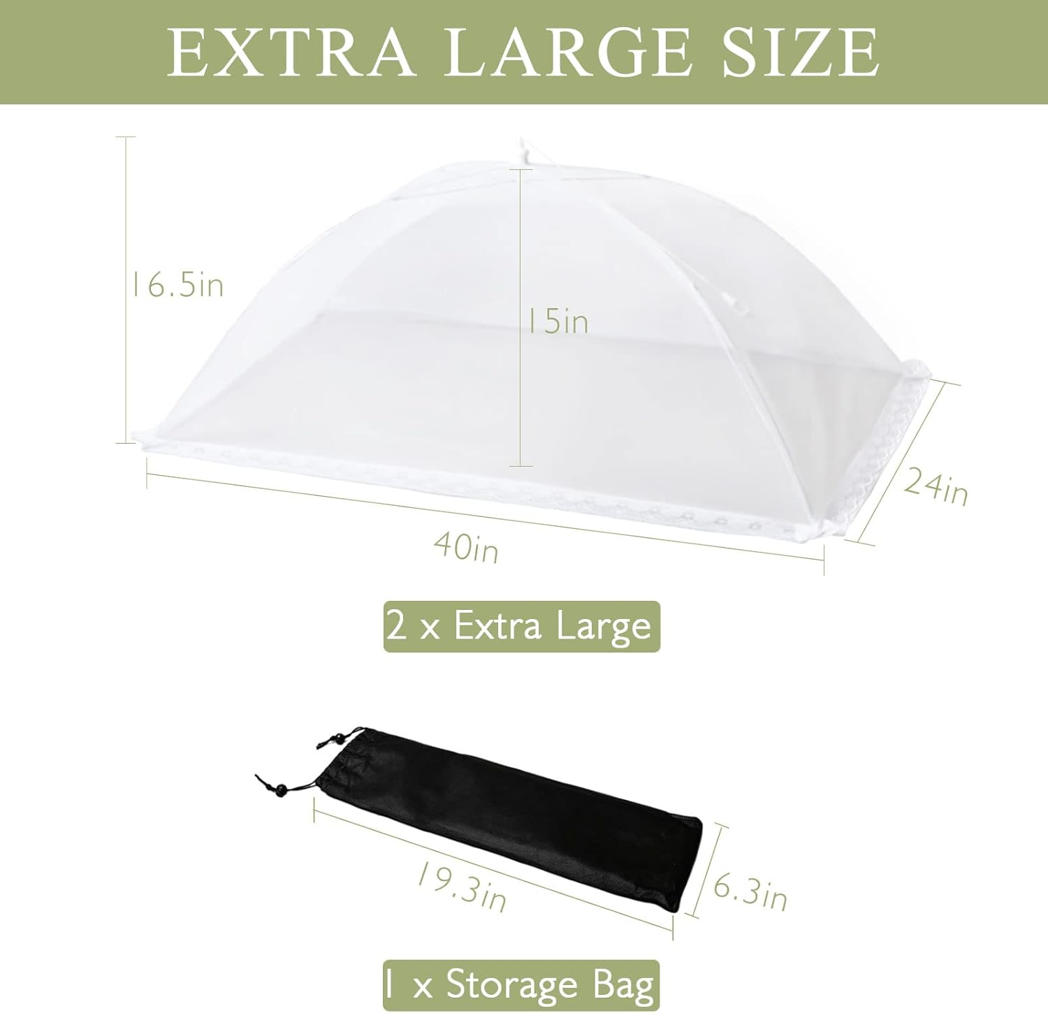 - [2 EXTRA LARGE SIZE ] The food cover set contains 2 enlarged sizes: 40" L x 24" W x 15" H. The folded size is only: 15"x3", which can be placed in a picnic basket. Perfect for large outdoor gatherings, each food cover is enough to cover multiple plates of food such as pizza, sandwiches, tortillas, fruit salads, etc.