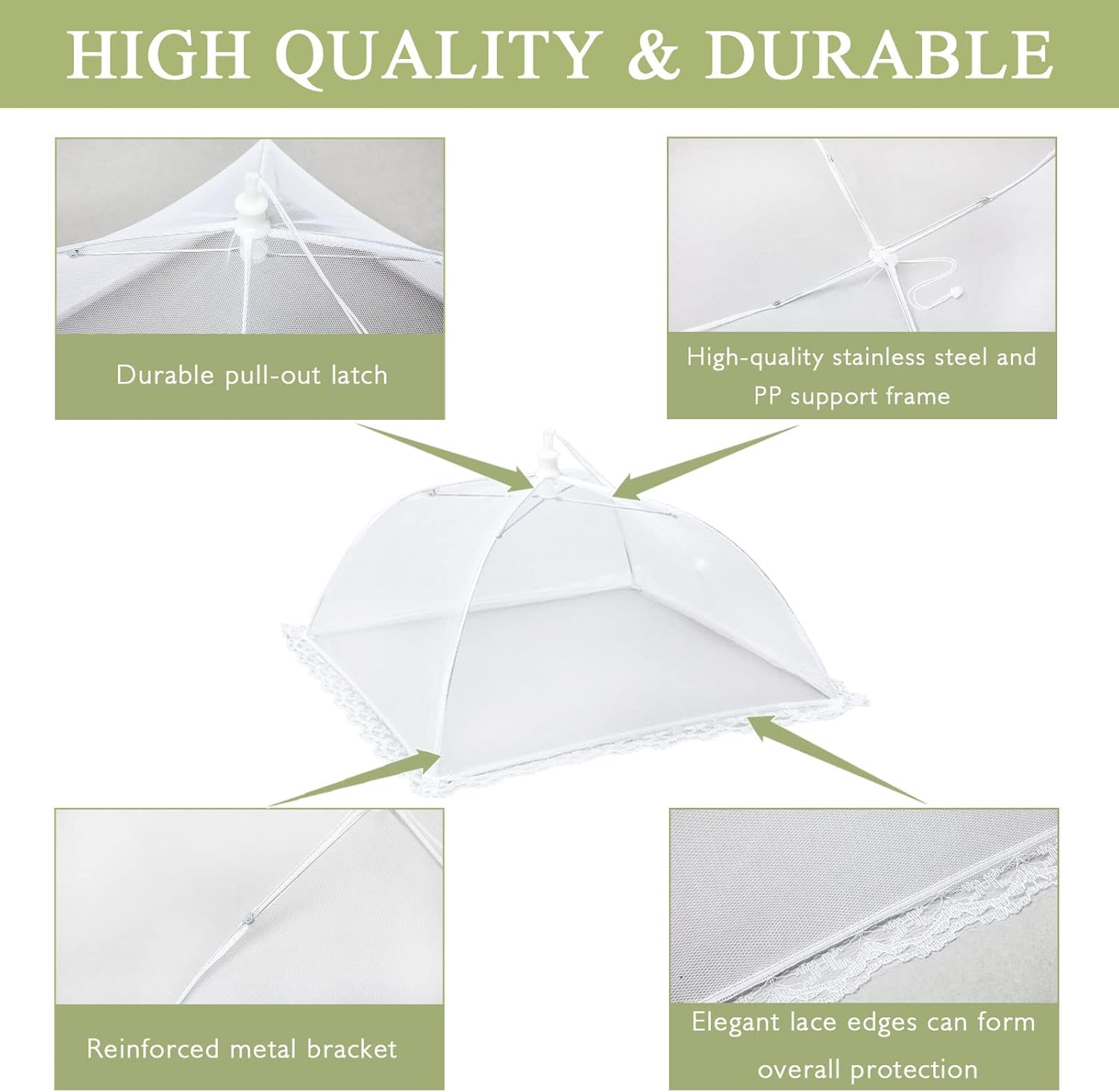 - [UPGRADE 1MM DENSE NET] This food covers for outside mesh uses an upgraded version of 1mm dense mesh, which provide superior protection against small flying insects.The elegant lace design at the bottom adds a touch of sophistication while effectively preventing bugs from reaching your food.