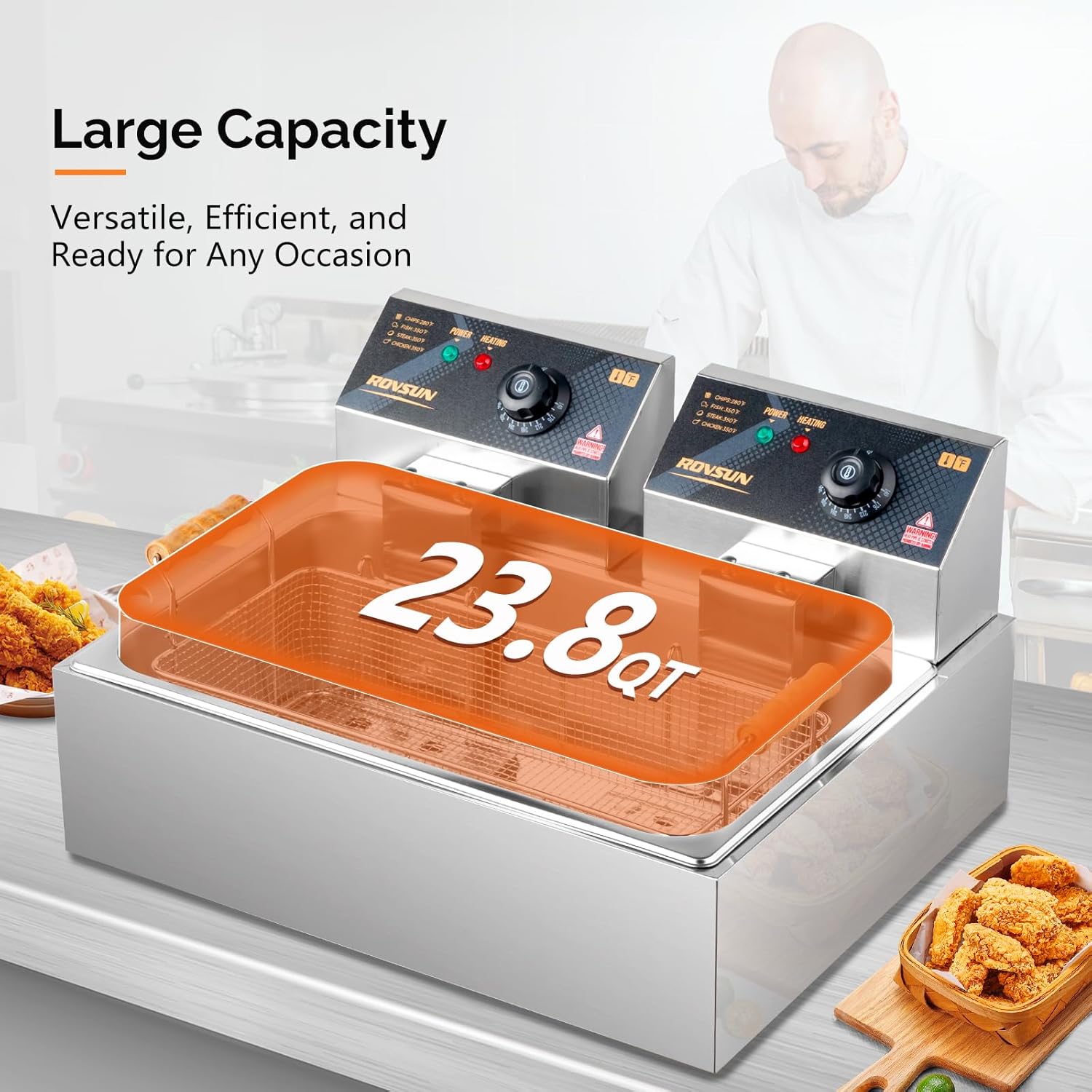 ROVSUN 23.8Qt Electric Deep Fryer with Basket, Lid & Adjustable Temp, Commercial Deep Fryer Countertop, Stainless Steel Kitchen Fat Fryer Frying Machine for French Fries Turkey Onion Rings 5000W