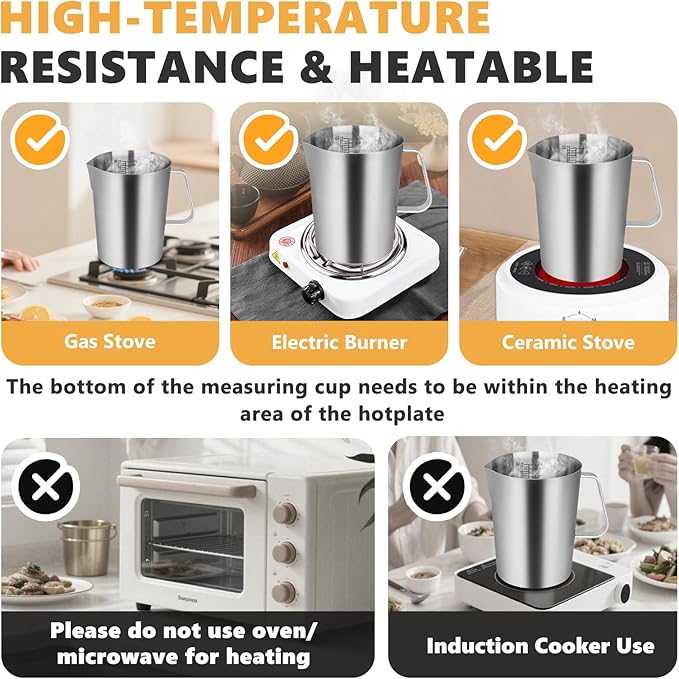 - High Temperature Resistance and Heatability: This stainless steel measuring pitcher is suitable for use on electric burners, ceramic stoves and gas stoves, but not suitable for induction cooktops. For open-flame use, maintain low-to-medium heat (ensure the flame does not exceed the base diameter to prevent damage)