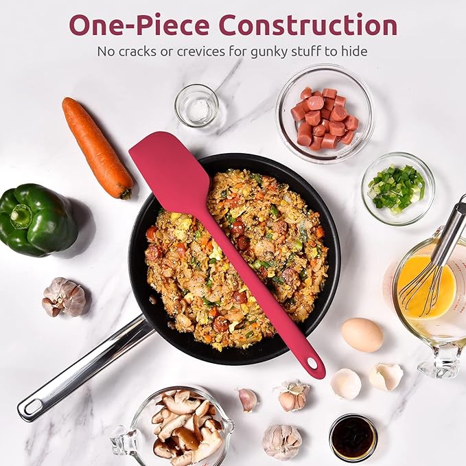 - [600ºF Heat-Resistant for High Heat Cooking] With up to 600 degrees heat resistance, you can use this nonstick silicone spatula in a hot pan without worrying about melted plastic in your dinner. It also works well with high temp sugars, chocolates or sauces. A must for newer cooks who might tend to leave utensils in a nonstick pot while cooking. You can use this heat safe silicone scraper daily for everything from stirring to frying to smoothing.