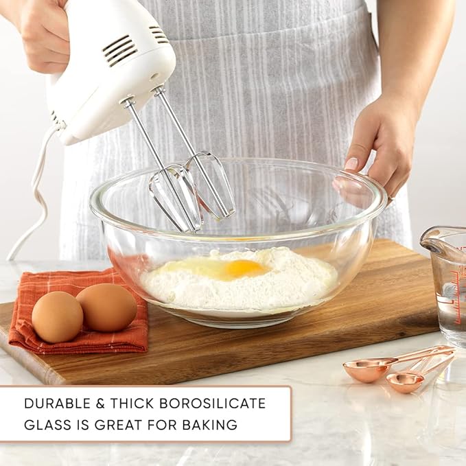 - Durable Bowls That Nest With Ease: When it comes to glass mixing bowls, you want them sturdy, thick, clear, and space saving, right? If so, you’ll probably love these five strong mixing bowls with lids. They neatly nest with a handle on top for easy compact storage! Cook for Joy, JoyFul by JoyJolt.