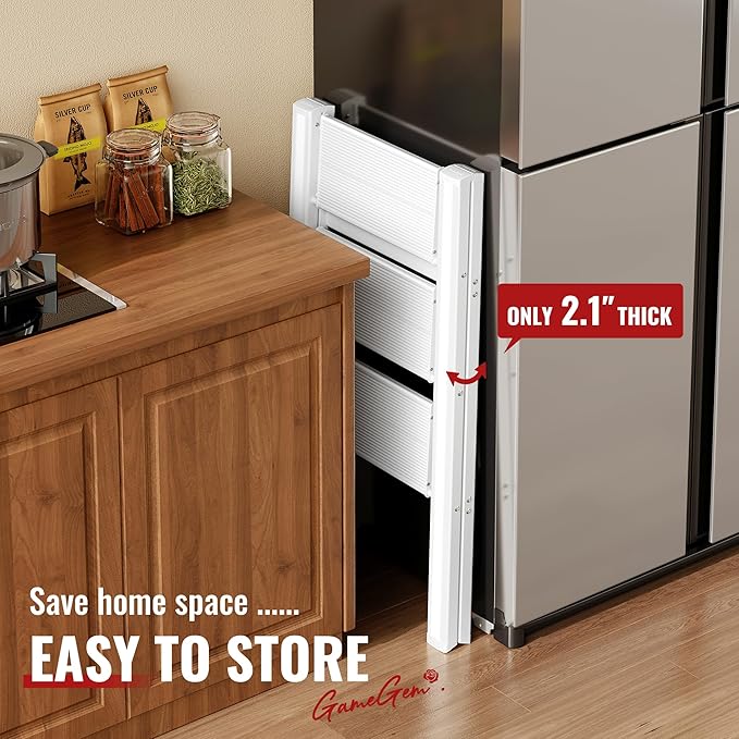 GameGem 3 Step Ladder, Aluminum Folding Step Stool with Anti-Slip Sturdy and Wide Pedal, Lightweight Portable Stepladder for Home and Kitchen Use Space Saving, Cream White, 330 lbs