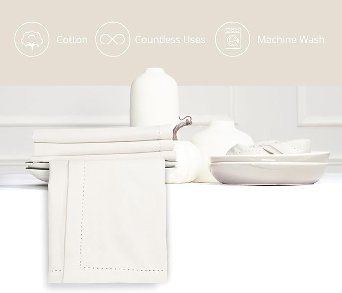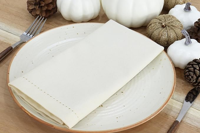 PurpleEssences Set of 12 Hemstitch Cloth Dinner Napkins 100% Cotton - Soft Durable Washable - Ideal for Wedding Christmas Holiday Winter - Perfect Everyday Use Table Linen 18x18 - Cream