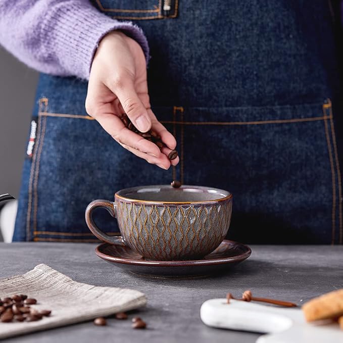 Vintage Design 12 oz Ceramic Latte Art Cappuccino Barista Cup with Saucer (Embossed Grey)