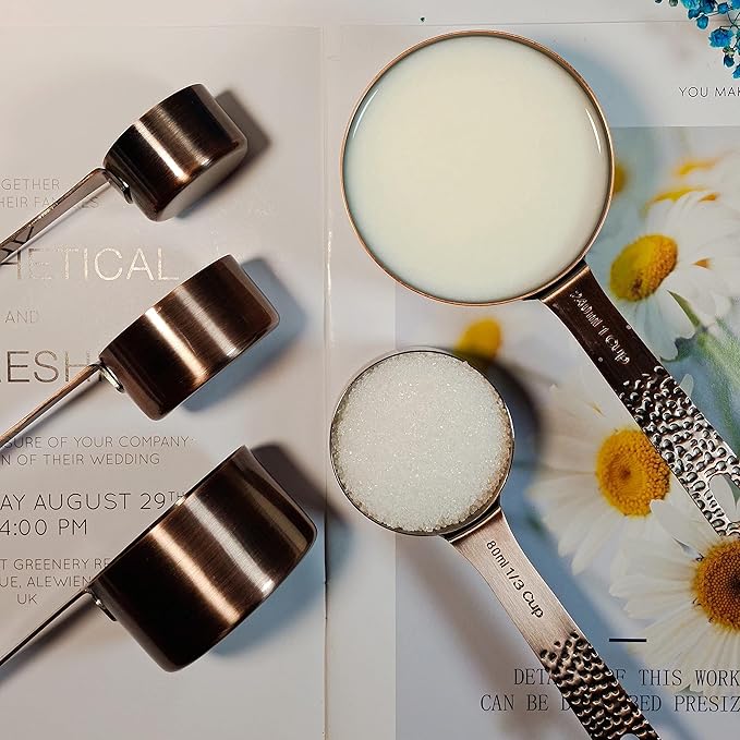 - ✱✱ Hotsyang copper measuring cups set of 7 : includes includes 1/8cup 30ml, 1/4cup 60ml, 1/3cup 80ml, 1/2cup 120ml and 1 cup 240ml, premium stainless steel copper measuring cups, 1 ring