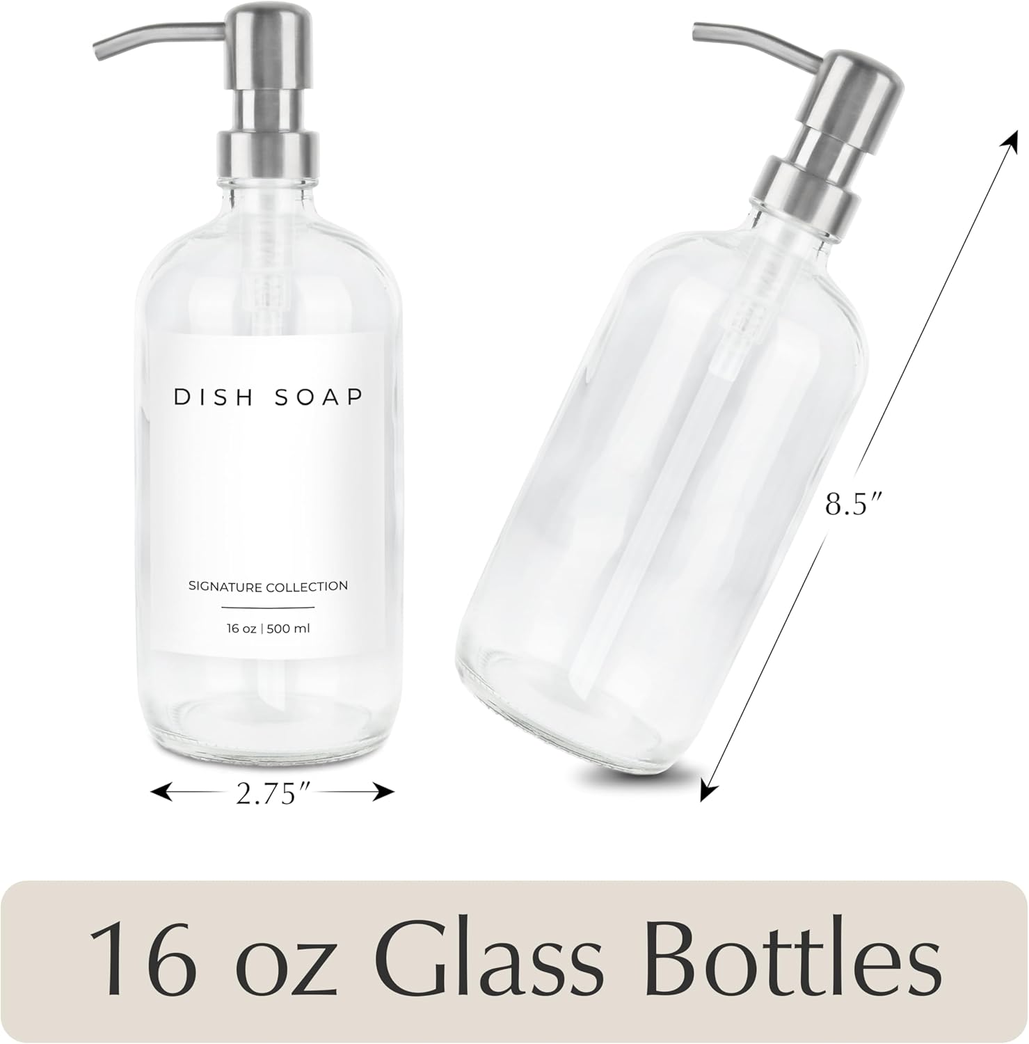 - ✅ 2-in-1 COMBO: Upgrade your home with our glass soap dispenser set. The dish soap dispensers are crafted from the highest quality glass and can be used as soap dispensers for kitchen sinks, soap dispensers for bathrooms, or as hand soap dispenser of your favorite liquid. The kitchen soap dispensers come with 2 dish soap dispensers for kitchen bottles (16 ounces), 2 stainless steel pumps, and 5 waterproof labels. Our selection includes colors including amber, clear, white, and black.