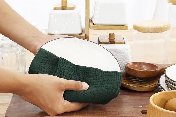 - EASY CARE - For better absorbency, wash the dish towels before first use. Cotton waffle Dish Cloths are thinner and flatter when new, and shrink after washing to form cozy little honeycombs which make it an absorbent dish towel. They can be machine washed multiple times in cold/hot water with similar colors for easy cleaning after any big spill or heavy load of dishes.