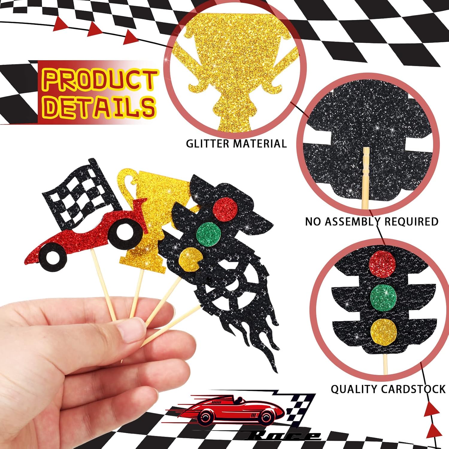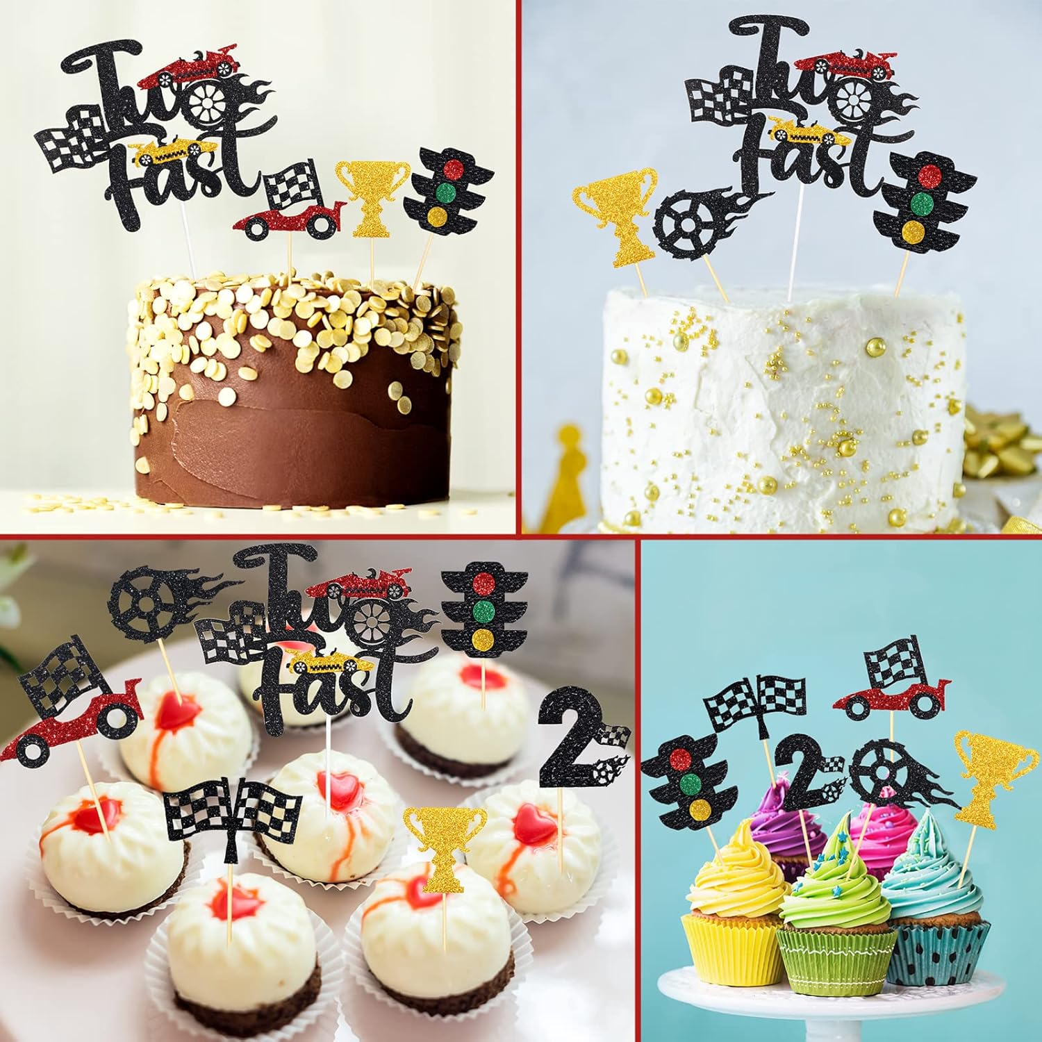 Gersoniel 49 Pack Two Fast Cake Toppers Cake Decoration Double Sided Trophy Flag Race Car Birthday Party Supplies
