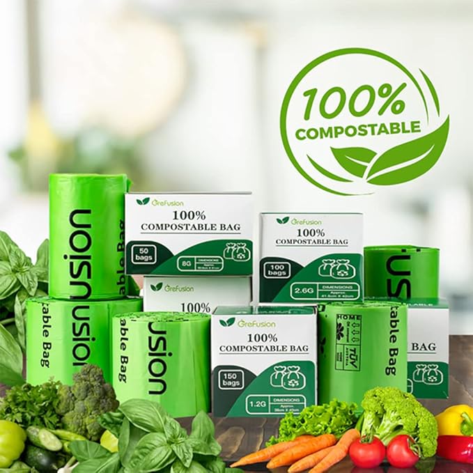 - 【ECO FRIENDLY TRASH BAGS &COMPOSTABLE】These compostable garbage bags are made from corn starch, that break down in compost bin or local green waste collection,worm farms,soils. The green trash bags feed the micro-organisms in the soil when composted,which benefits the Earth and its surroundings. Replace harmful plastic kitchen trash bags with our green compostable trash bags to reduce environmental waste and create a brighter future together.