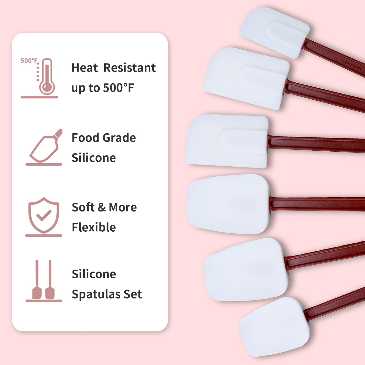 - 【Quality Material】 These silicone spatulas are made of 100% food-grade silicone blade and nylon handle, can withstand temperatures up to 500 degrees Fahrenheit. This spatula does not stain or fade or discolor, is odorless, durable, and will not crack when used in high temperatures. Meets NSF standards, 100% food safe