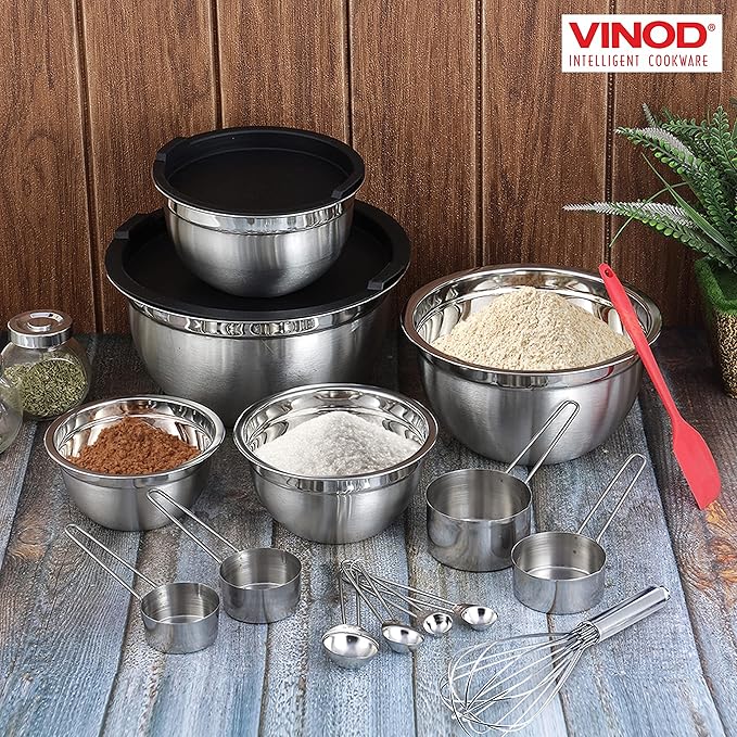 Vinod Cookware Heavy Duty Flat Bottom Stainless Steel Mixing Bowls with Lids, Measuring Cups, Measuring Spoons, Spatula & Stainless Whisk - Bowls for Meal Prep, Cooking, Mixing & Serving - Set of 5