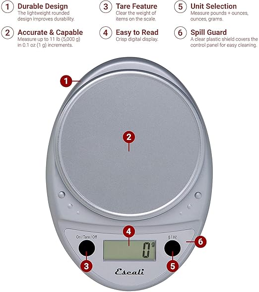 - The P115C kitchen scale is (8.5 x 6 x 1.5 in) has a capacity of 11 lb (5,000 g) and provides weight readings in 0.05 oz (1 g) increments using the following units: oz, lb:oz, g