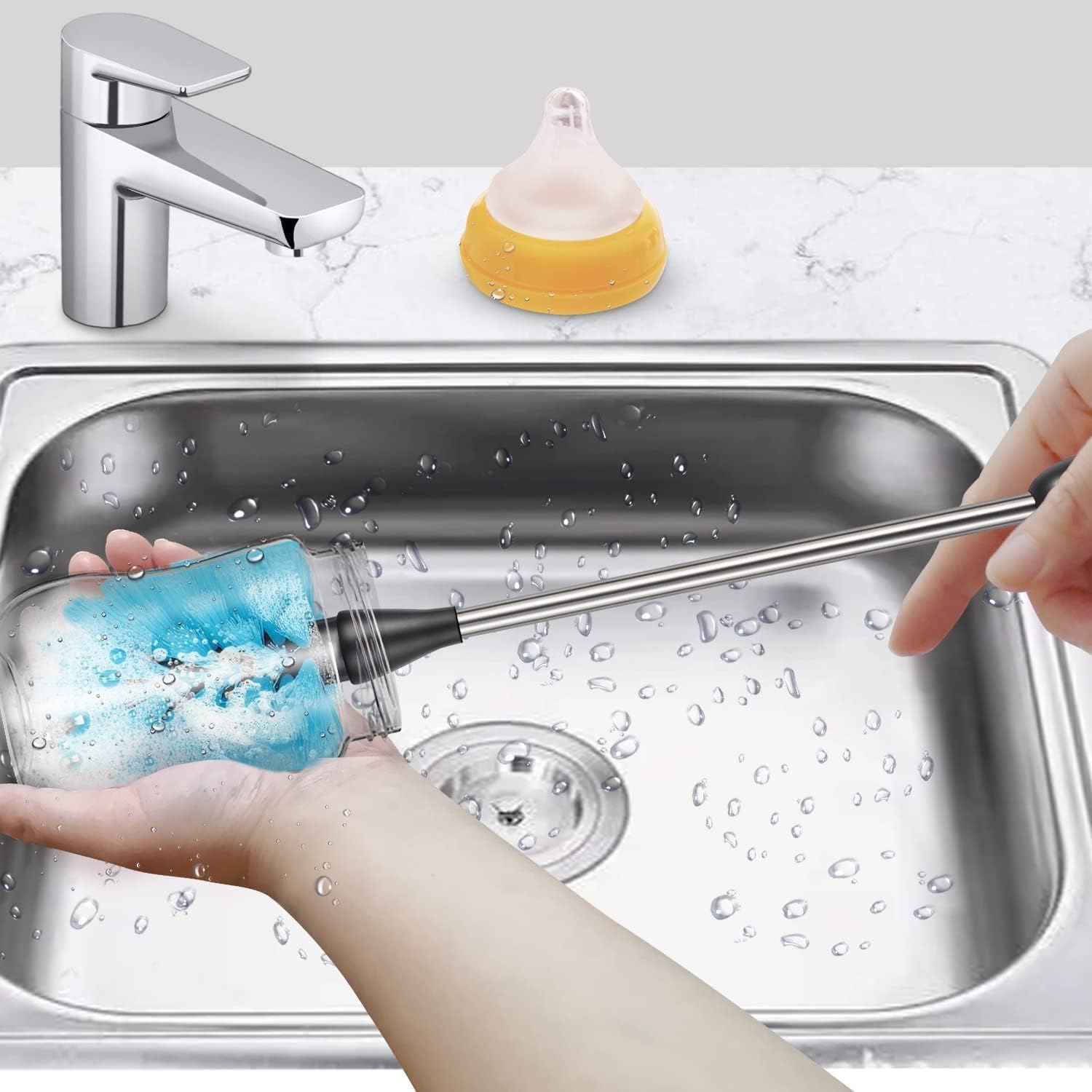 - Rubber-covered long handle is ergonomically designed with grooves for a comfortable grip.14.9-inch elongated soft bottle brush reaches the bottom of the bottle and allows for powerful water-flush scrubbing brushes.