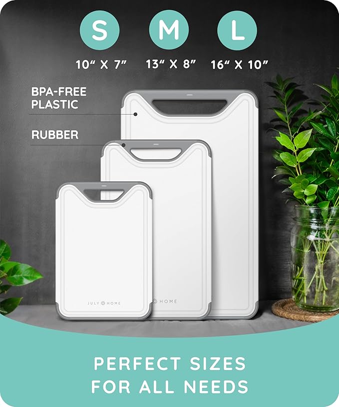 - š AMPLE SURFACE AREA! Cooking at its best with our new and improved plastic cutting board set! This chopping board, 3 piece set comes in three accommodating sizes for daily kitchen tasks, available in: 16"x10"x0.31"; 13"x8"x0.31"; and 10"x7"x0.31ā. Providing you with enough room for all your meal prep needs! Easy to clean, they are ideal cutting boards for kitchen dishwasher safe assurance.