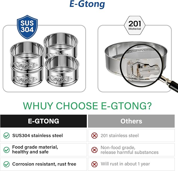 - TOXIN-FREE & SAFE MATERIAL- E-Gtong Cake Pan Set is Made of the High Quality 304 Stainless Steel, Strong and Durable, Rust-Free, No Black Coating Material Peeling off, BPA Free, Heat-resistance.