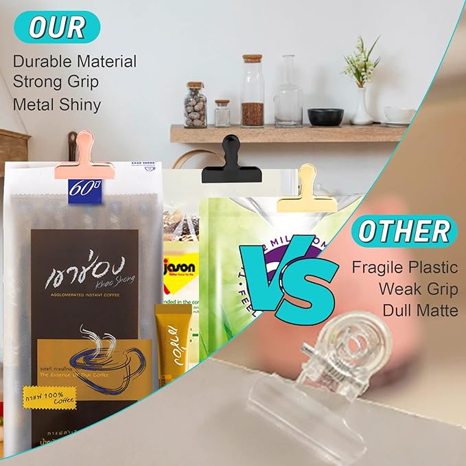 - 【CHIC DESIGN COLORED CLIPS】-We have black bag clips, gold bag clips and rose gold bag clips. Stylish design and bright color- good to match all your metal kitchen stuff and also very hefty and springy for your food storage and keep your food fresh in the opened bags.