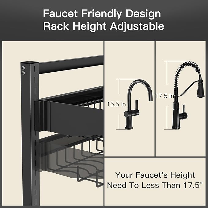 - ๐ Expandable Design for Custom Fit: Adjust the over sink dish drying rack width effortlessly to span most standard single or double sinks, adapting seamlessly to your kitchen layout. The dish drain modular design allows rearranging tiers and accessories to prioritize space for tall glasses, wide pans, or cleaning tools, maximizing vertical storage above the sink