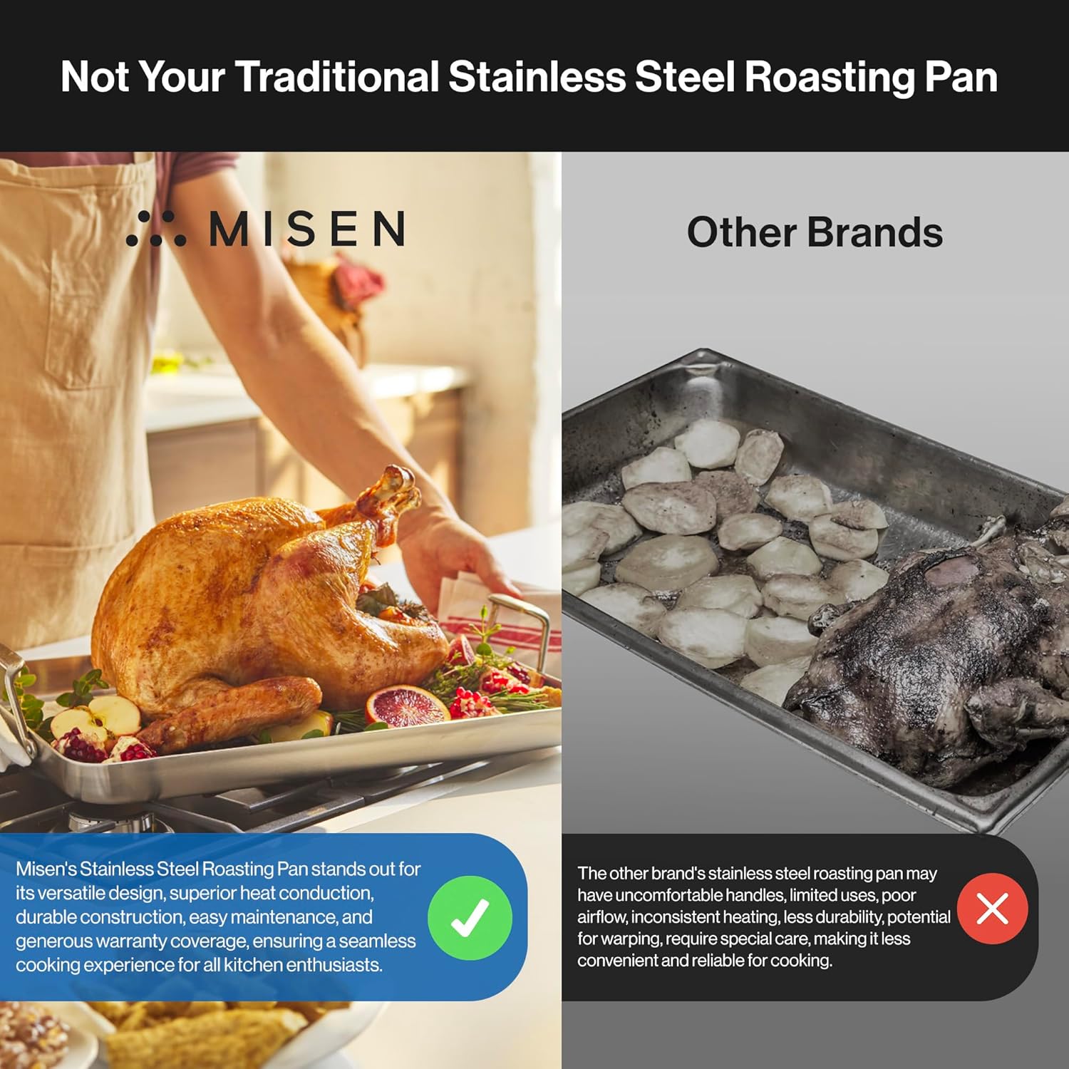 - All-in-One Helper: Misen's Stainless Steel Roasting Pan isn't just a pan—it's your kitchen buddy for baking, searing, and roasting. Keep things simple with this all-in-one wonder that works for all kinds of cooking.