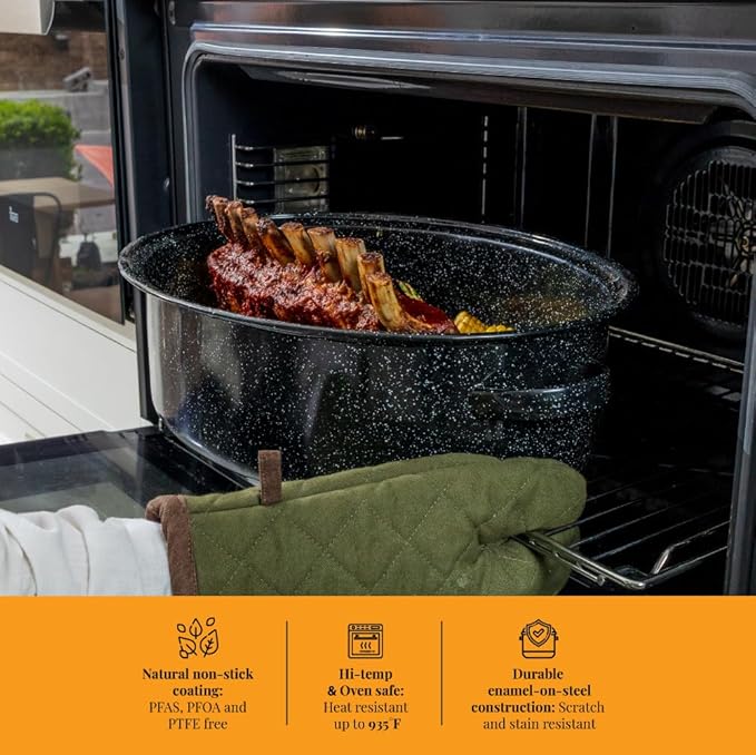 - Includes an 18-inch Enamel on Steel Speckled Black Oval Roaster with Lid that can accommodate up to a 15 lb poultry or roast and is resistant to temperatures up to 935°F, providing versatile cooking options.